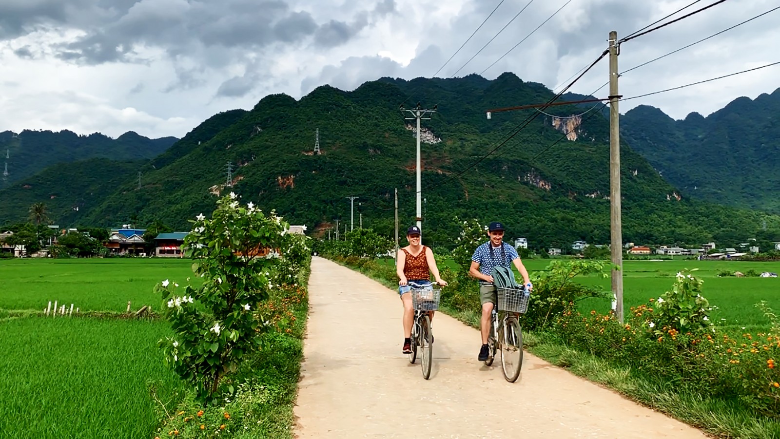 12h00: Ăn trưa tại Mai Châu. Sau bữa trưa, Quý khách có thể khám phá thung lũng Mai Châu bằng xe đạp (hoặc xe điện, chi phí thuê xe đạp hoặc xe điện tự túc). Quý khách thăm những ngôi nhà sàn nhỏ xinh của người Thái để tìm hiểu những nét văn hóa độc đáo của họ, thăm những gian hàng thổ cẩm, cùng học cách dệt thổ cẩm của người Thái và mua những món quà lưu niệm nơi đây. Sau đó Quý khách tự do đạp xe hoặc dạo bộ và mua sắm đồ, chụp hình.